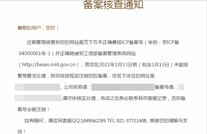 • 近期管局核查網(wǎng)站首頁下方是否正確懸掛ICP備案號及鏈接到工信部網(wǎng)站http://beian.miit.gov.cn,收到通知郵件請及時聯(lián)系我司,以免因未處理而注銷備案。