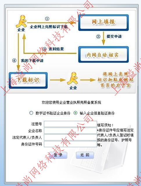 點擊“企業(yè)網(wǎng)上亮照標識下載”模塊,輸入“用戶名”和“密碼”進行登錄(首次登錄的用戶須先進行注冊),進入“企業(yè)營業(yè)執(zhí)照亮照備案系統(tǒng)”頁面,輸入企業(yè)信息(企業(yè)標識、注冊號、企業(yè)名稱、法定代表人/負責人、證件號)驗證身份。已經(jīng)領取數(shù)字證書(營業(yè)執(zhí)照電子副本)的企業(yè),可直接用數(shù)字證書驗證企業(yè)身份。