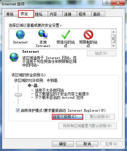 2、點(diǎn)擊“安全”選項(xiàng)卡,選擇“自定義級(jí)別”,如下圖所示:
