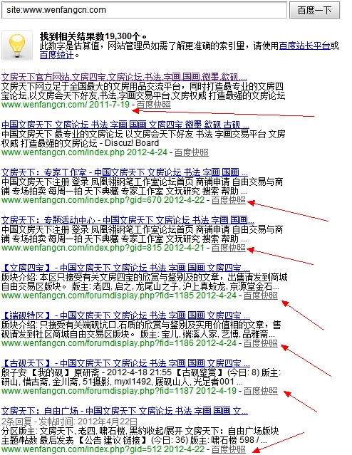 對(duì)于百度快照,也有人單純的用SITE指令看下對(duì)方頂級(jí)域名或者WWW域名的快照更新日期(有人能承受三天之內(nèi),有人能承受7天之內(nèi)),筆者不反對(duì)這個(gè)參考指標(biāo),但是作為我們更好關(guān)注除掉首頁的快照之外的內(nèi)頁快照,如下圖: